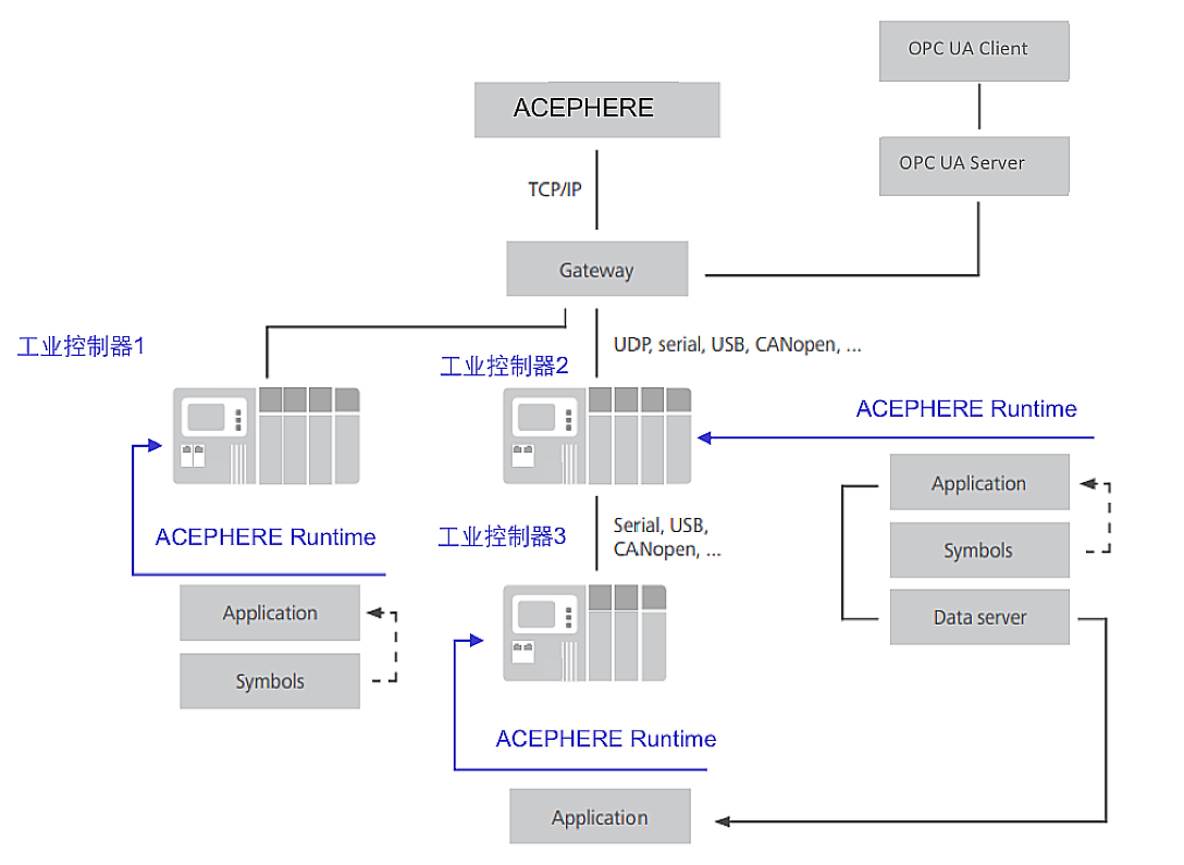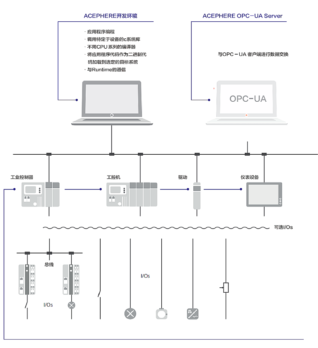 ACEphere Runtime 運行時環境 ——工業控制器運行系統。ACEphere Runtime將不同設計的智能工業設備轉換成根據IEC 61131-3標準可編程的控制器。它可以在ACEphere Studio的幫助下適應設備的特定屬性。
