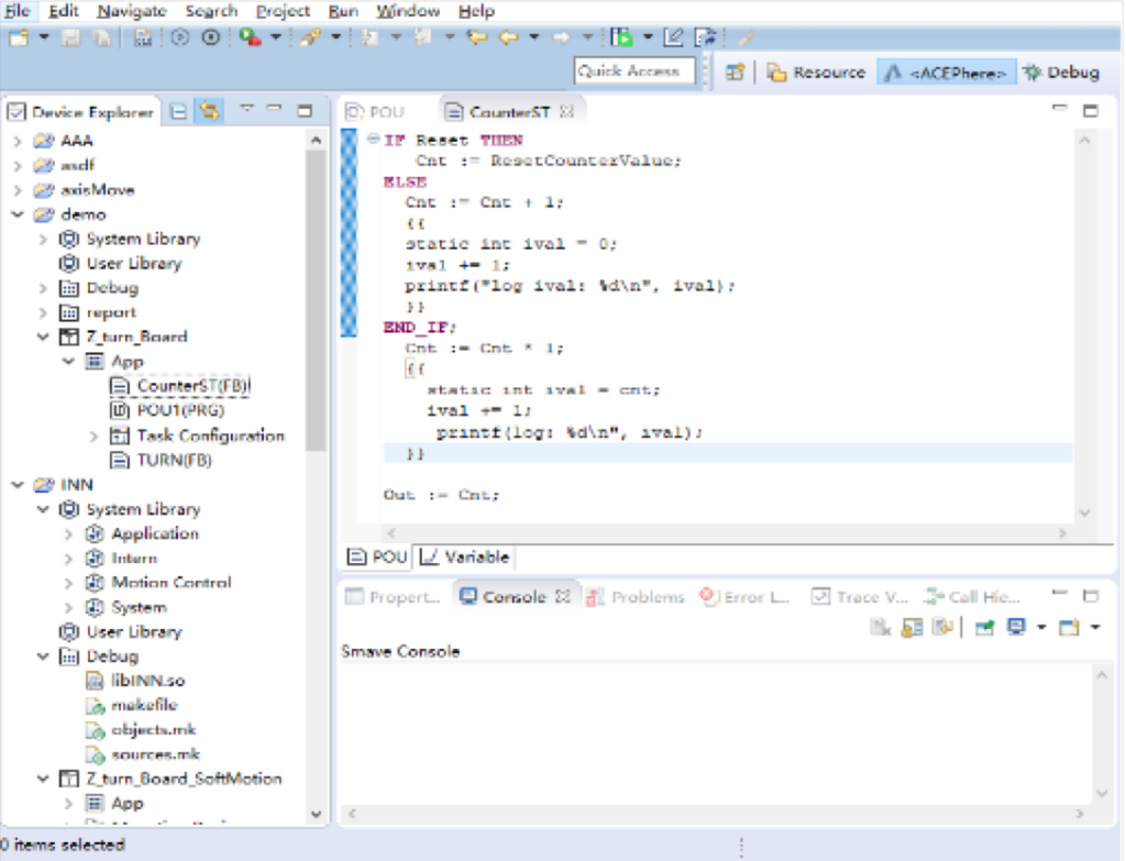 用戶可以動態地將現有的或生成的C代碼(例如從Matlab/Simulink等工具)集成到應用程序中,并從IEC 61131-3程序中調用它。為此,C對象將被無縫地集成到ACEPHERE項目樹中。一個完全集成在ACEPHERE開發環境的文本編輯器允許對C源代碼進行基本擴展和修改。